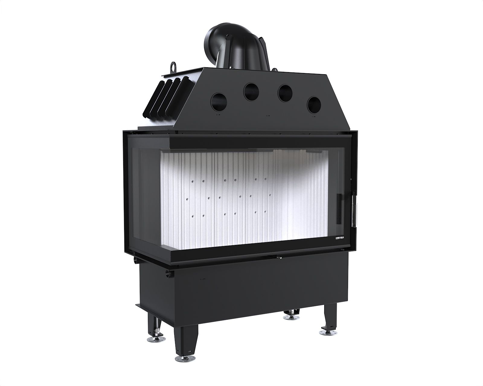 Dodatkowe boczne przeszklenie po lewej stronie zwiększa widoczność paleniska w narożnych aranżacjach, zachowując użytkowy charakter serii Intra.