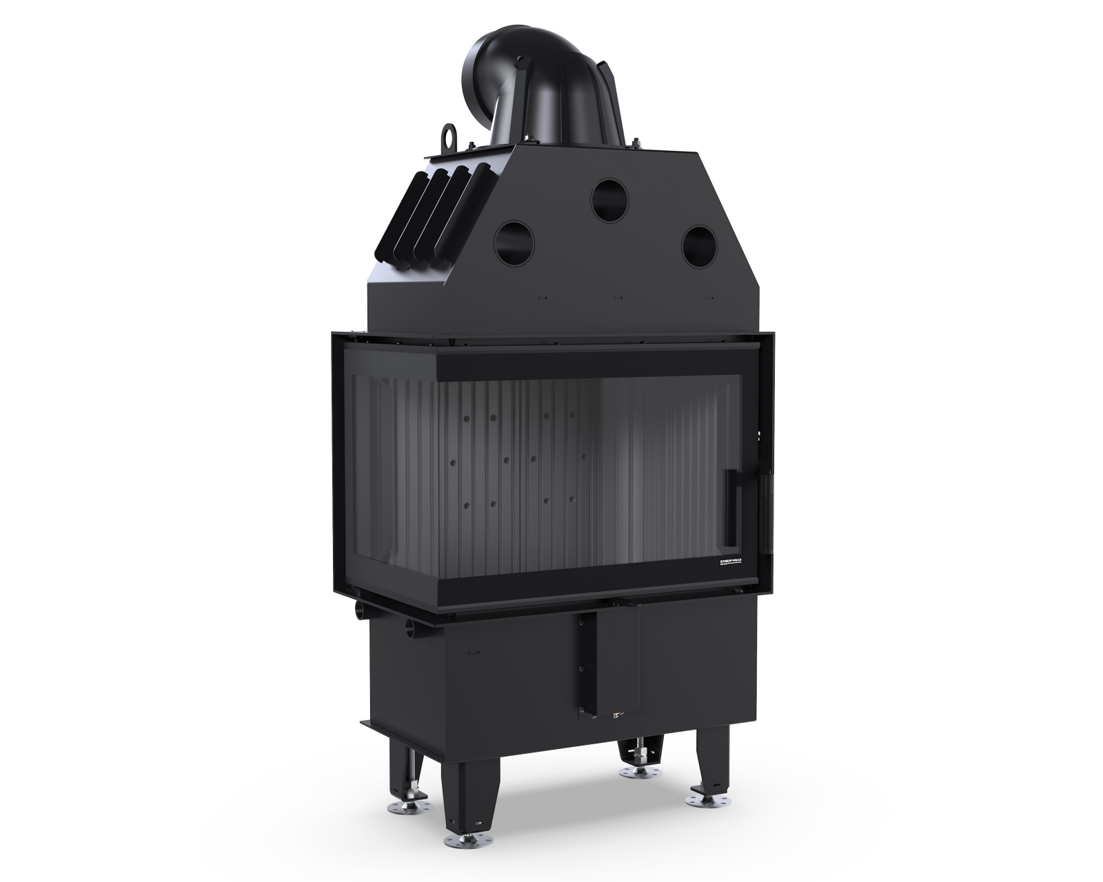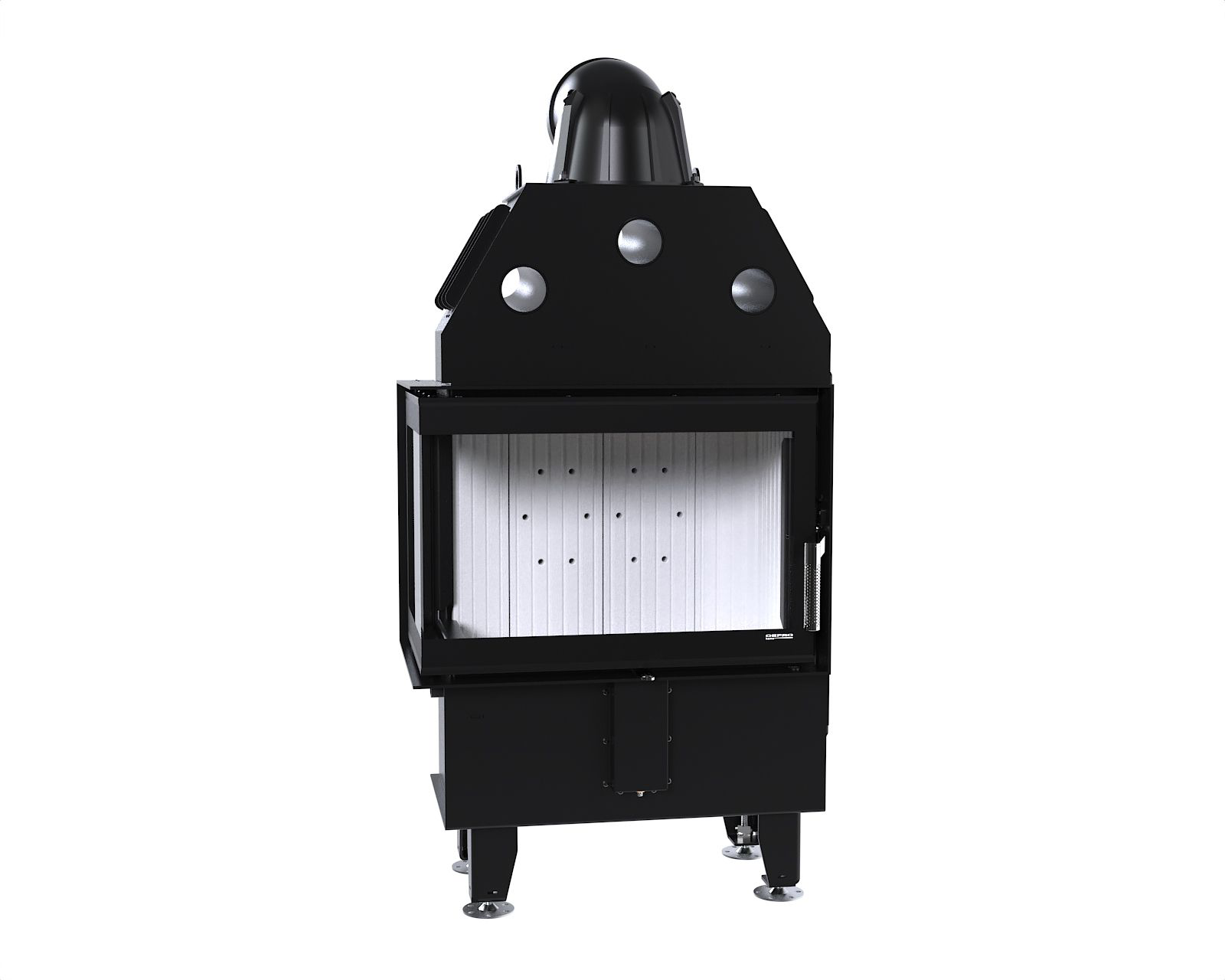 Dodatkowe przeszklenie po lewej stronie umożliwia widok paleniska z kilku perspektyw w narożnych zabudowach.