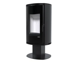 Obła forma piecyka oraz szerokie przeszklenie frontowe zapewniają efektowny widok ognia i harmonijnie wpisują się w nowoczesne aranżacje wnętrz.
