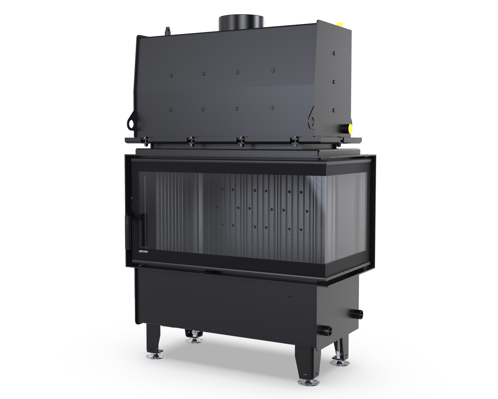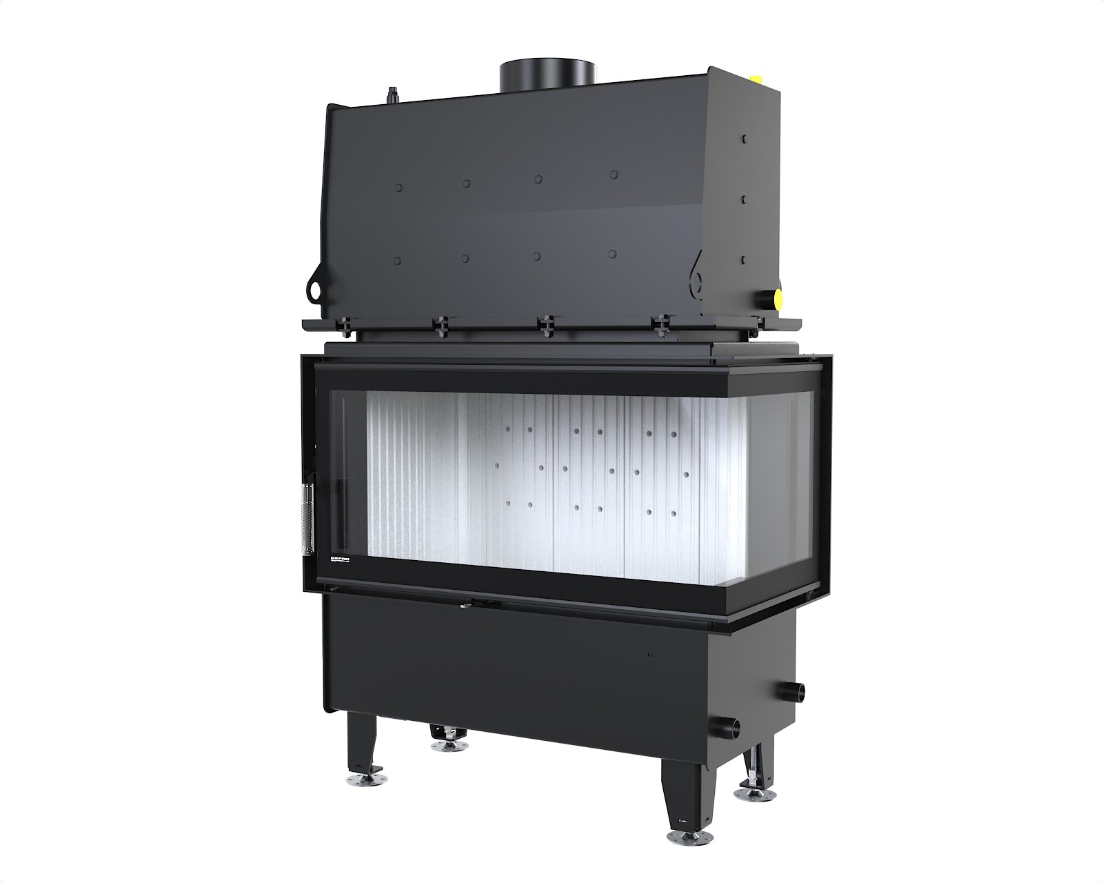 Dodatkowe przeszklenie po prawej stronie pozwala na atrakcyjny widok paleniska z kilku perspektyw, idealny do narożnych i nowoczesnych zabudów kominkowych.